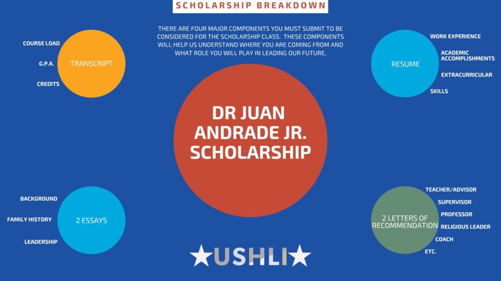 - Leadership Essay – Submit a 500-1,000 word essay on your view of the future of America, the kind of leadership needed, and any role you hope to play in providing such leadership. How will this benefit your community? What can USHLI do to help you achieve your goals?